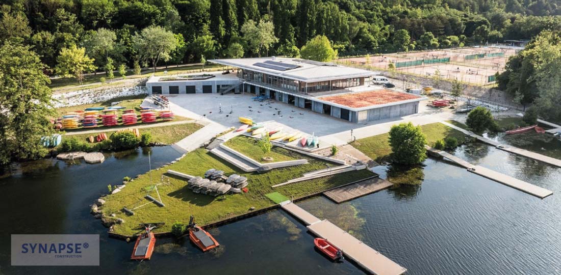 Construction de la nouvelle base nautique avec espace de bureaux et de stockage.